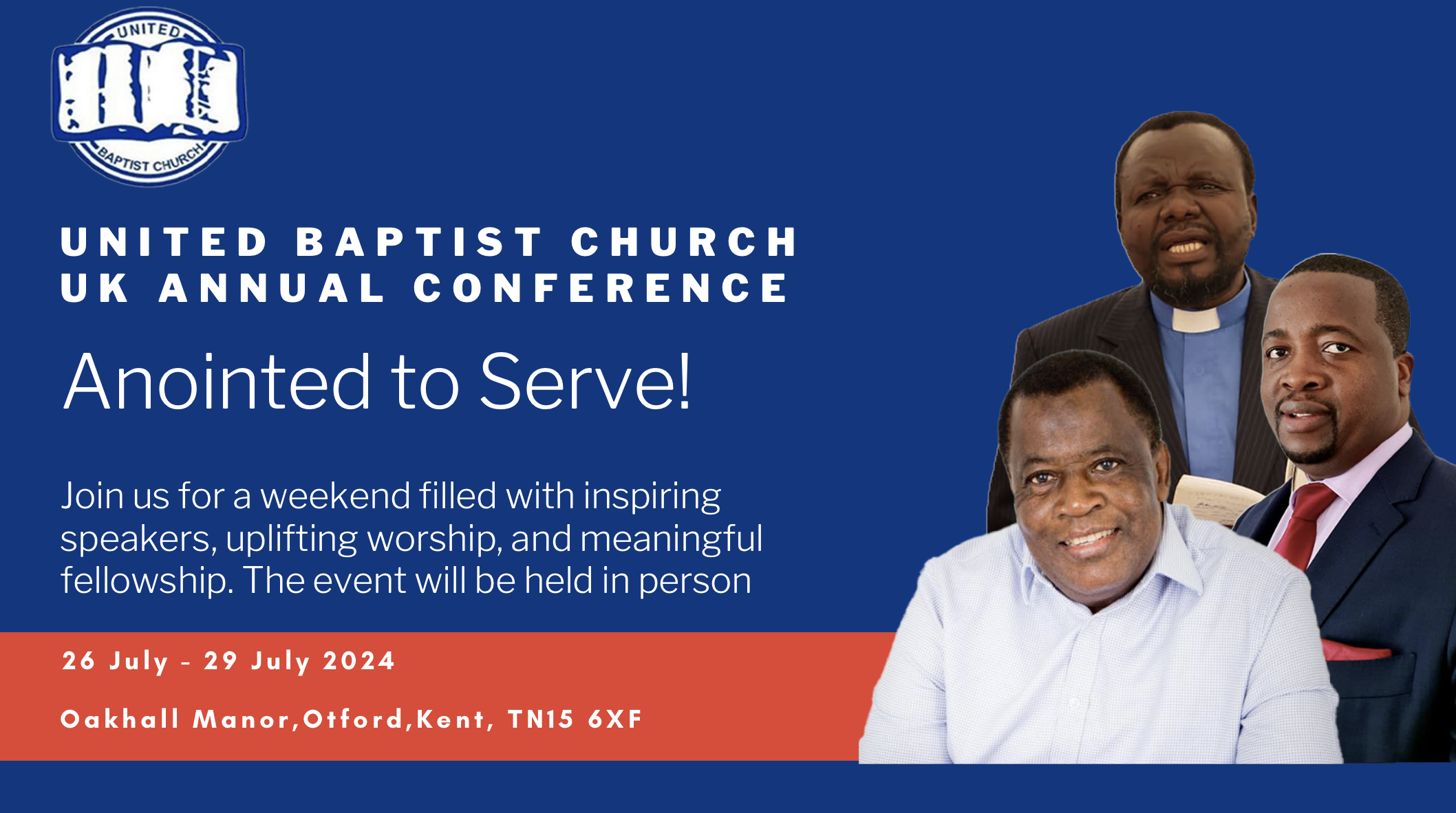 Welcome to the United Baptist Church UK annual Conference! This year's theme is Anointed to Serve! Join us for a weeken filled with inspiring speakers, uplifting worship, and meaningful fellowship. The event will be held in person at TN15 6XF. Don't miss out on this opportunity to grow in faith and connect with fellow believers. Come ready to be empowered and equipped to serve in your community. We can't wait to see you there!